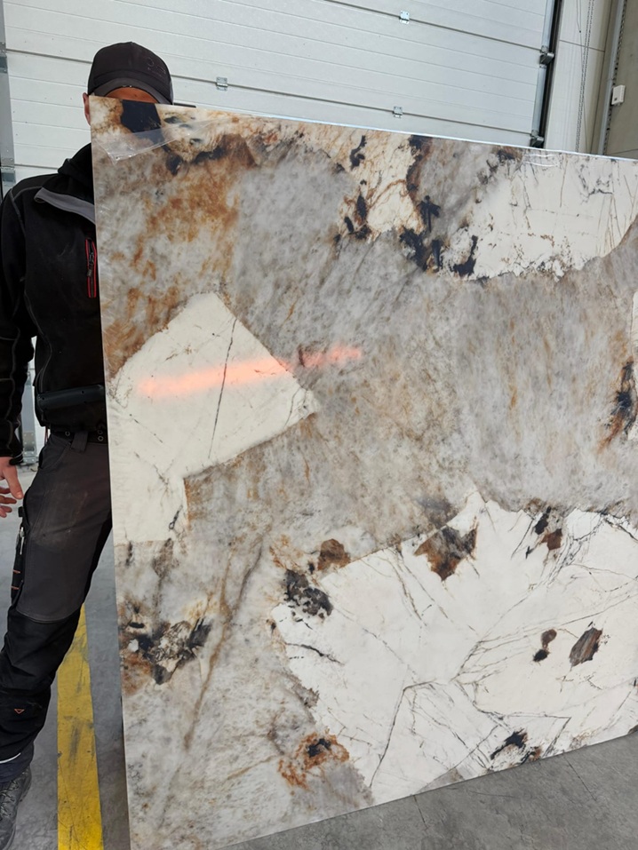 3. Proiectarea și Prelucrarea Pe baza măsurătorilor, blatul este proiectat digital, iar lastra de cuarț este prelucrată în fabrică, folosind utilaje de ultimă generație. În această etapă se realizează tăierile, frezările pentru margini și finisajele necesare pentru a transforma materialul brut în piesa finală.